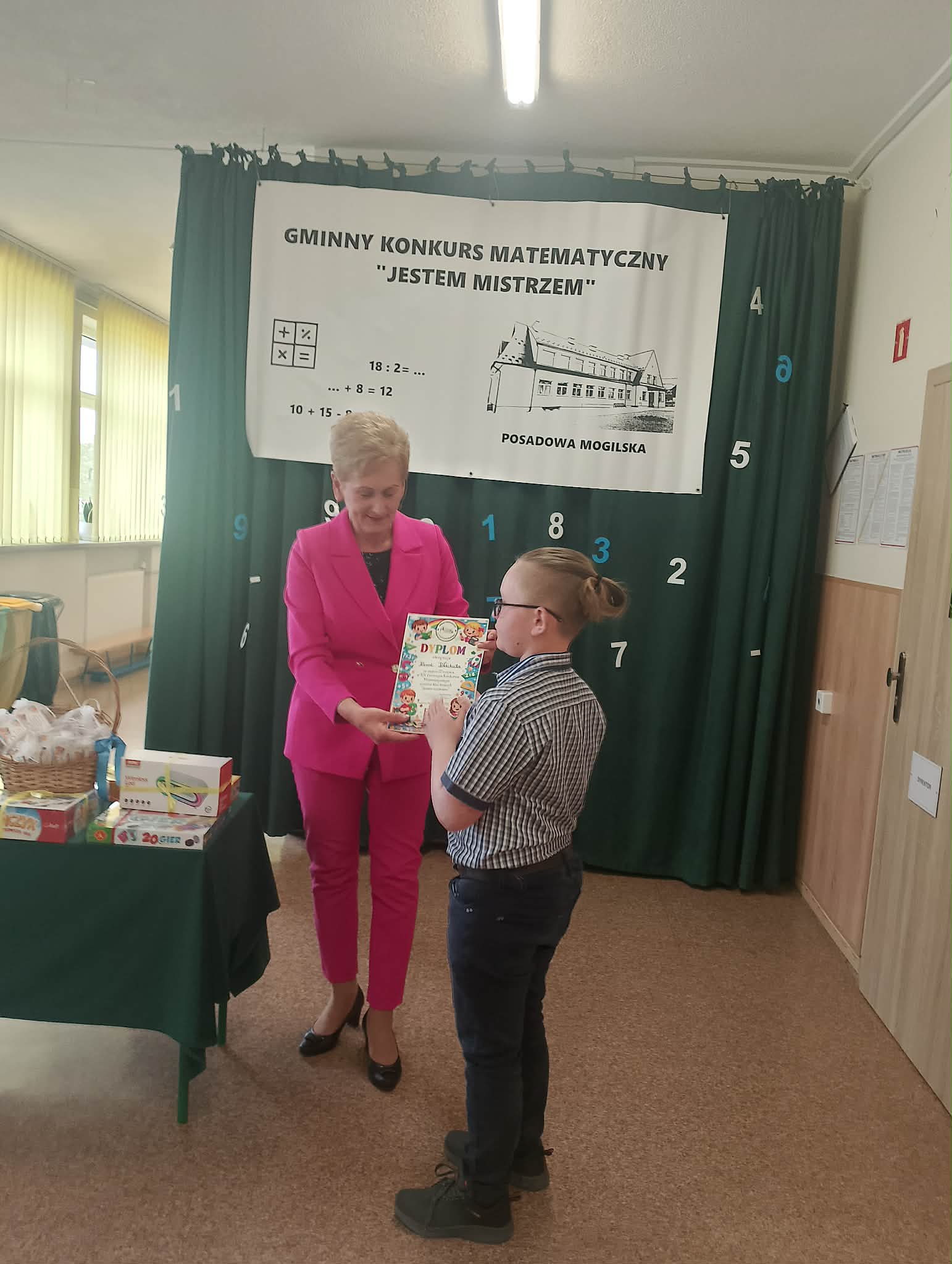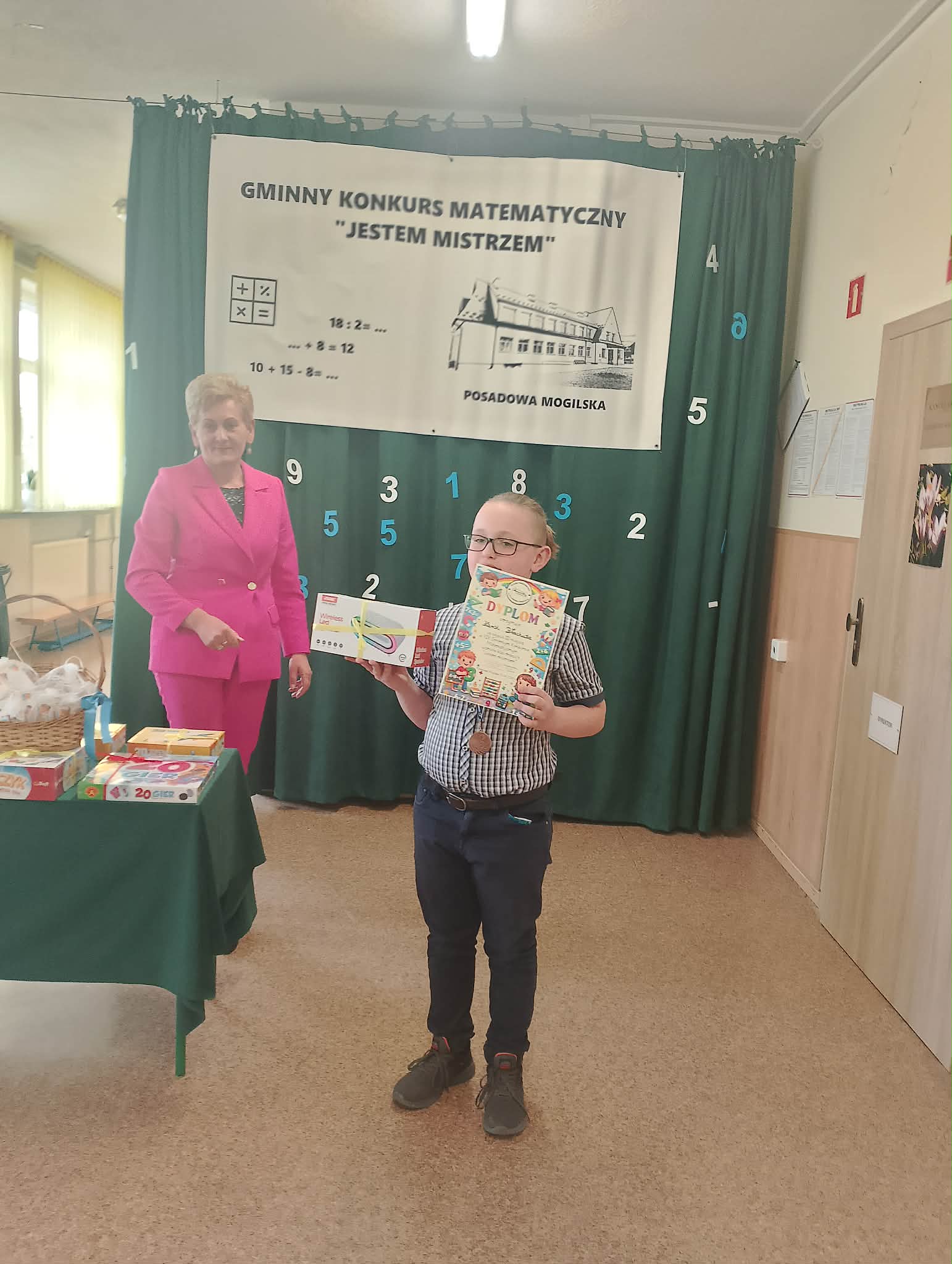 Pan Wiesław Kracoń – Przewodniczący Rady Gminy Korzenna wraz z panem Grzegorzem Kozakowskim Dyrektorem Szkoły wręczyli nagrody zwycięzcom.